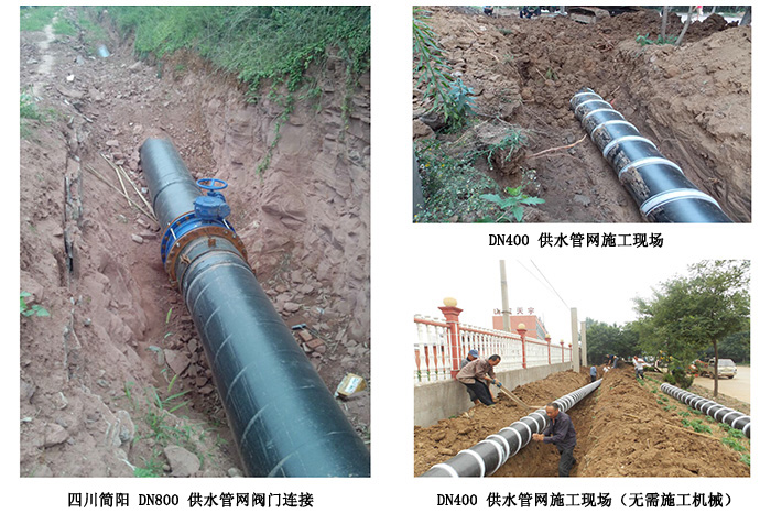 在工程施工方面,大口径乐投体育官方网站-综合赛事平台管也占很大优势。钢丝缠绕超高乐投体育官方网站-综合赛事平台管的比重约为1.2,而由于其壁厚很薄,直径可以小一号,其重量比铸铁管和PCCP管小5—10倍,搬运和安装非常轻便。超高乐投体育官方网站-综合赛事平台复合管的柔韧性很好,可以先在地面上连接好之后再下到管沟里,边挖沟边下管,边填埋。不用修路,不用大型机械,不用地基处理。铸铁管和PCCP管必须挖很宽的沟,管道下到沟里对正连接,受到很大局限,工程费用大幅上涨。在需要穿越江河的情况,超高分子量聚乙烯乐投体育官方网站-综合赛事平台管可用沉入法在江河底敷设,也可用拖拉法从江底隧道或管道中拖曳而过,这都是铸铁管和PCCP管做不到的。